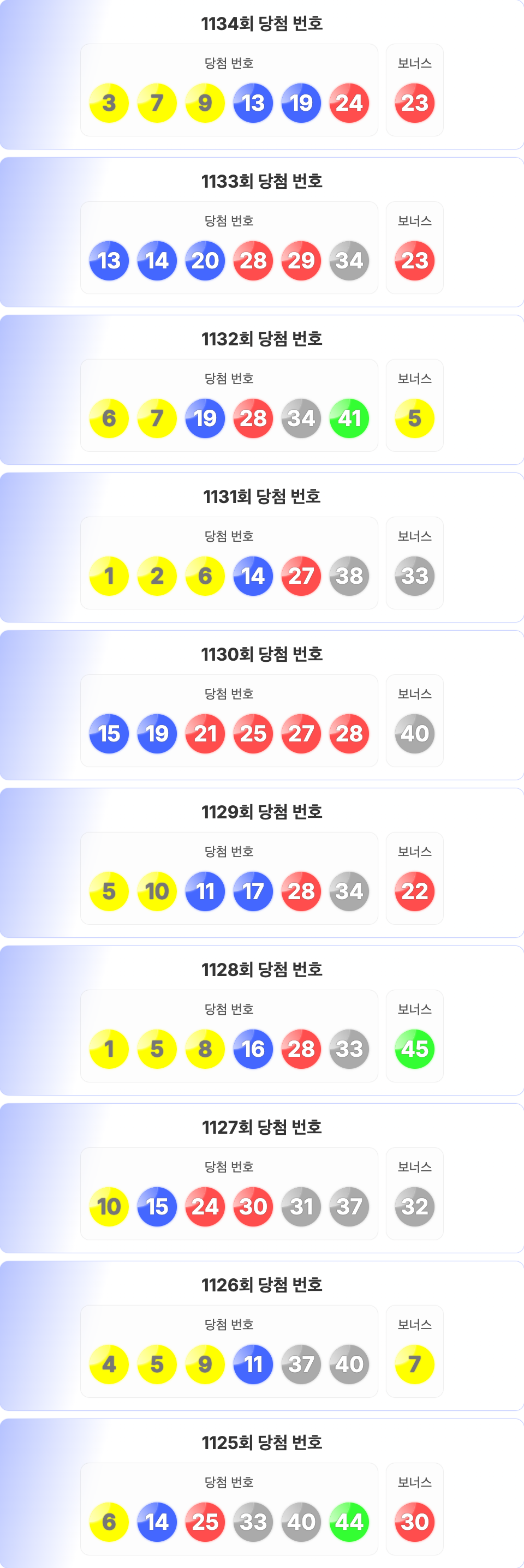 로또 1134회를 기준으로 최근 10회차의 당첨 번호 정리입니다. 1125회부터 1134회의 당첨 번호와 보너스 번호를 확인할 수 있습니다.