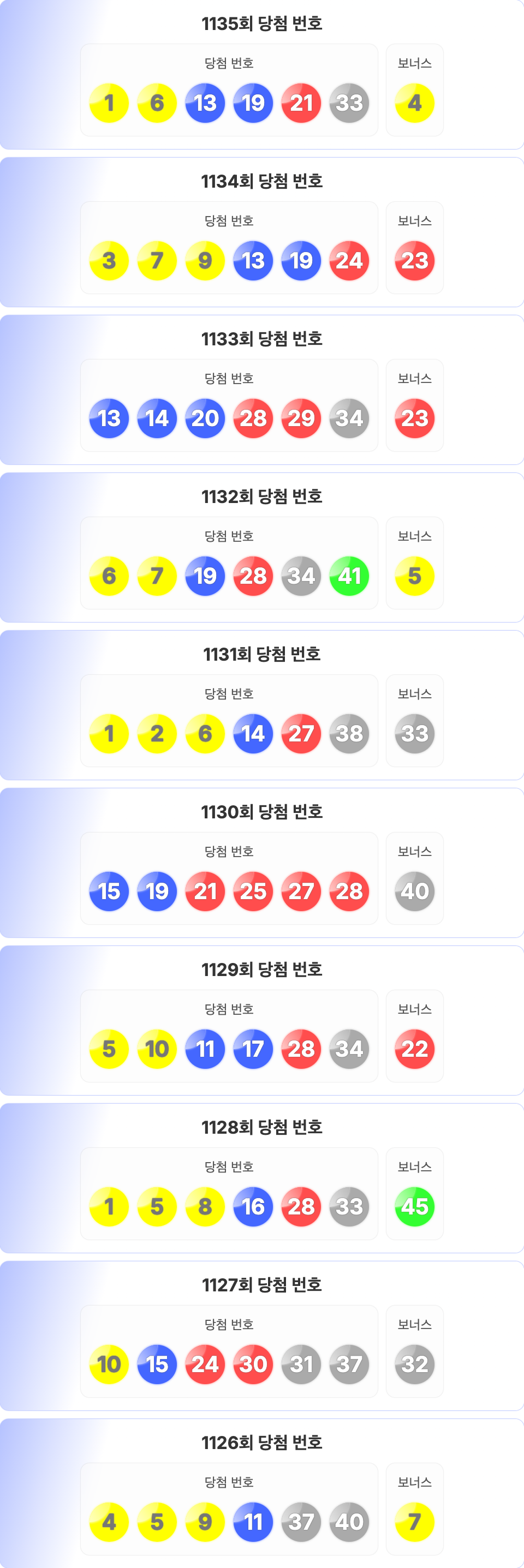 로또 1135회를 기준으로 최근 10회차의 당첨 번호 정리입니다. 1126회부터 1135회의 당첨 번호와 보너스 번호를 확인할 수 있습니다.