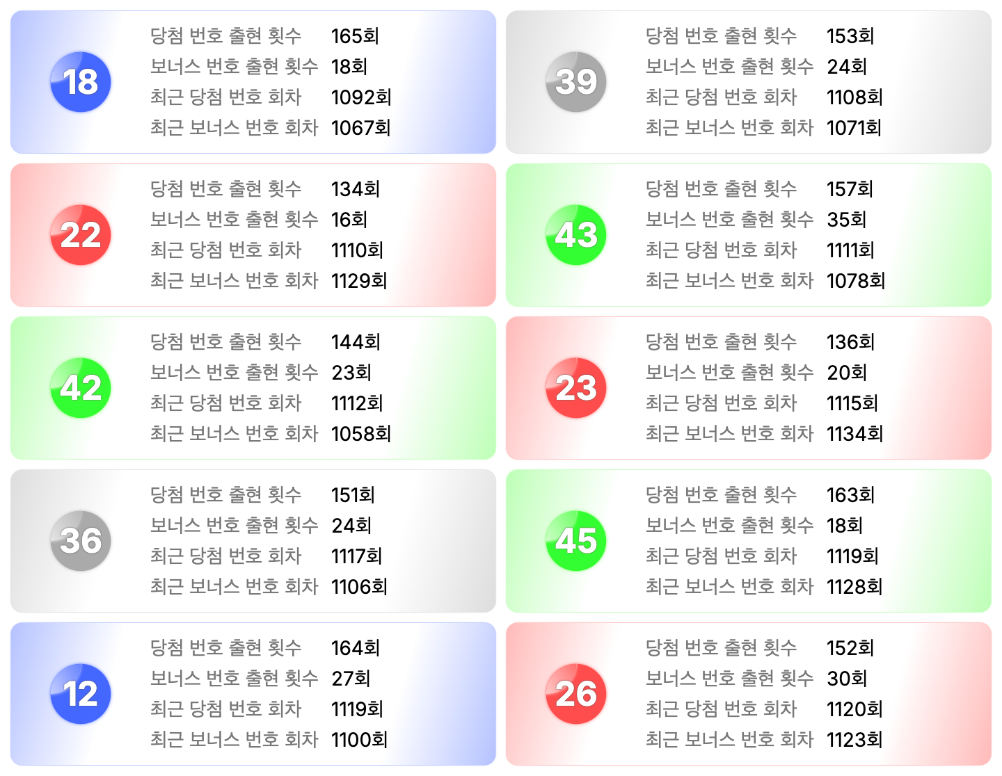 18번은 최근에 나온 회차가 1092회차로 43주 전에 출현했습니다. 18번은 당첨 번호로 165번, 보너스 번호로 18번 나와 총 183번 출현했습니다.