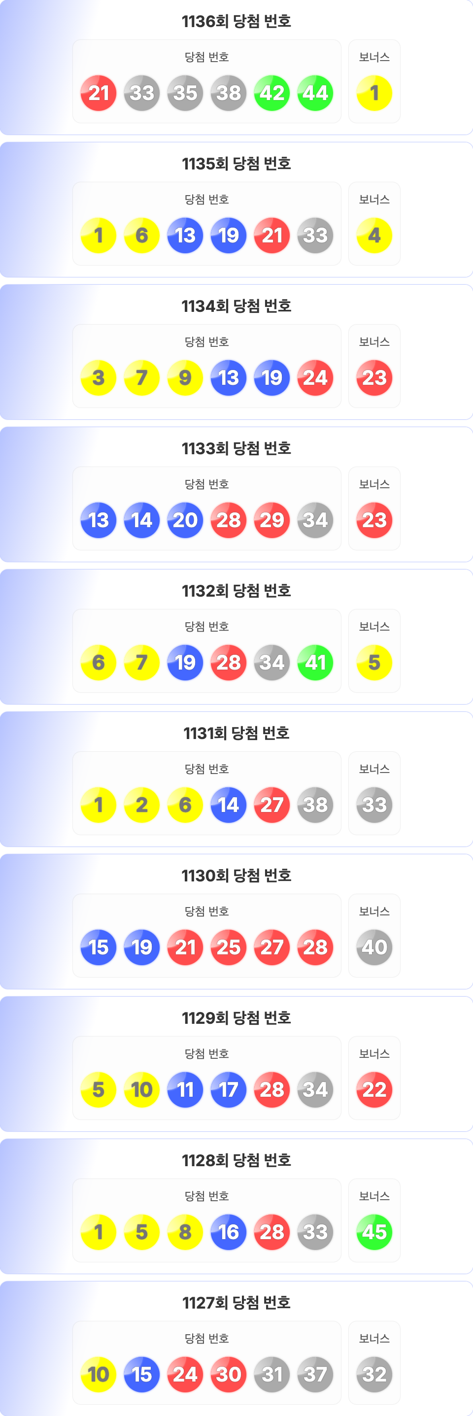 로또 1136회를 기준으로 최근 10회차의 당첨 번호 정리입니다. 1127회부터 1136회의 당첨 번호와 보너스 번호를 확인할 수 있습니다.