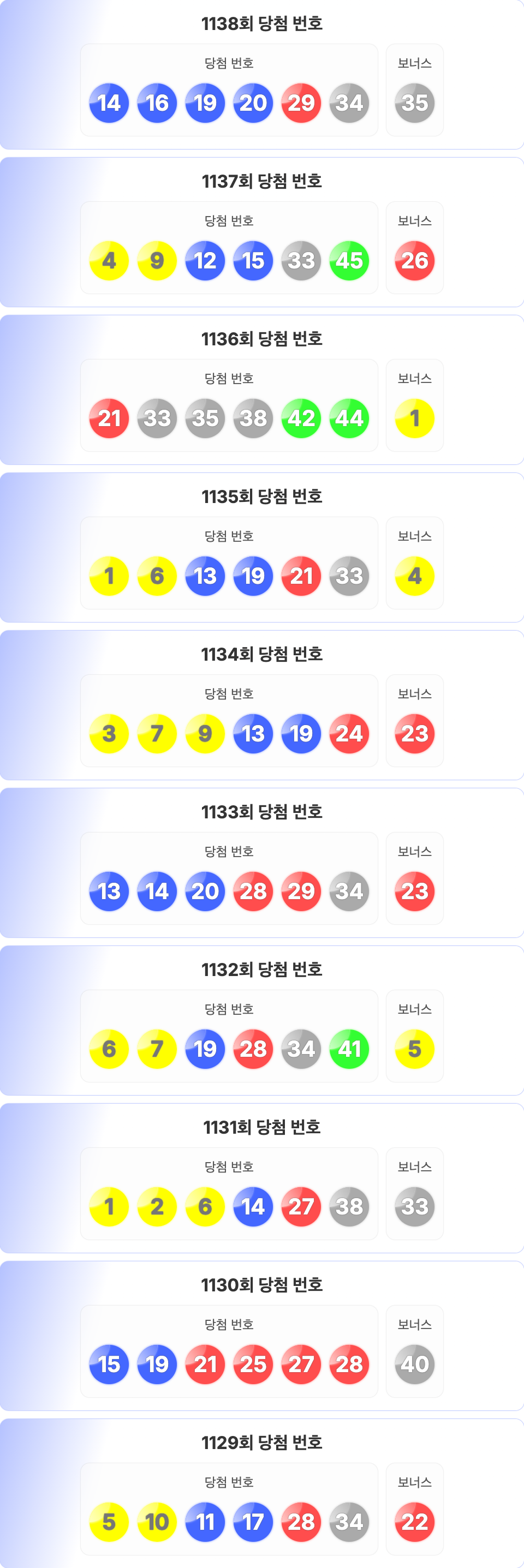 로또 1138회를 기준으로 최근 10회차의 당첨 번호 정리입니다. 1129회부터 1138회의 당첨 번호와 보너스 번호를 확인할 수 있습니다.
