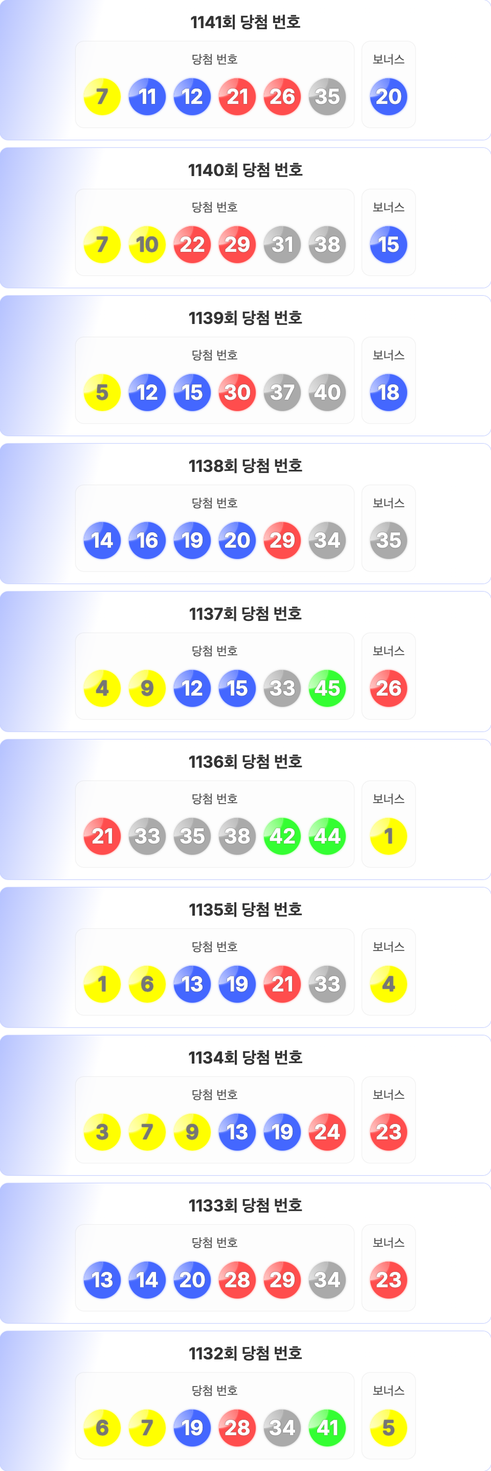 로또 1141회를 기준으로 최근 10회차의 당첨 번호 정리입니다. 1132회부터 1141회의 당첨 번호와 보너스 번호를 확인할 수 있습니다.