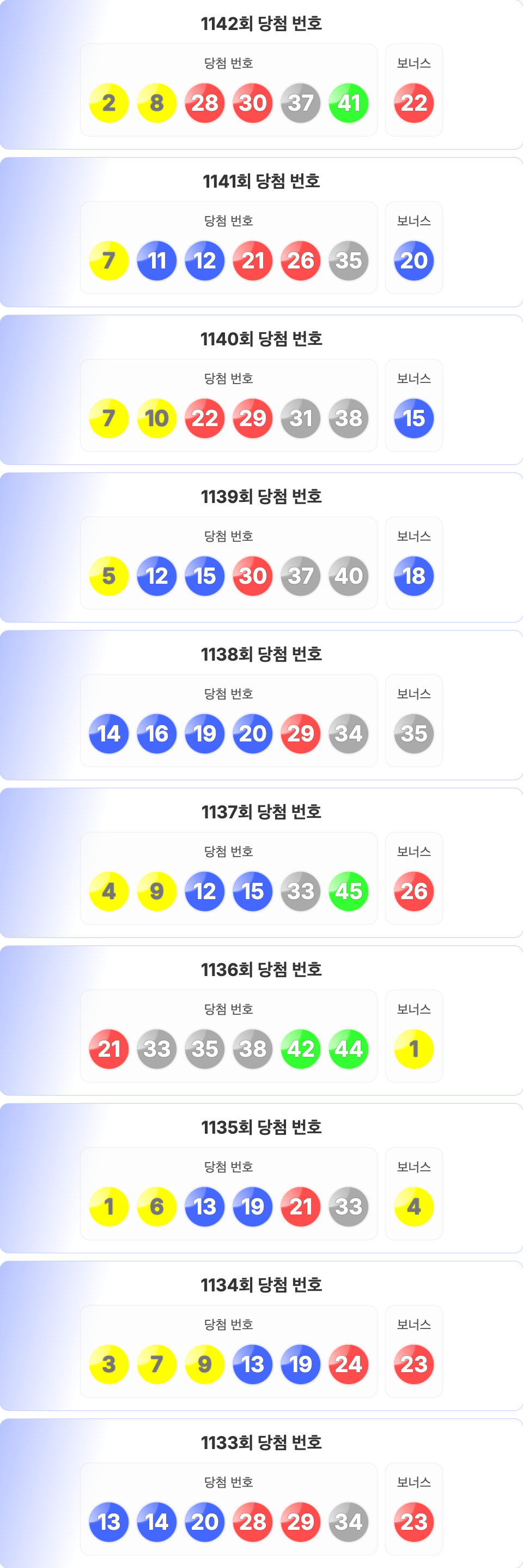 로또 1142회를 기준으로 최근 10회차의 당첨 번호 정리입니다. 1133회부터 1142회의 당첨 번호와 보너스 번호를 확인할 수 있습니다.
