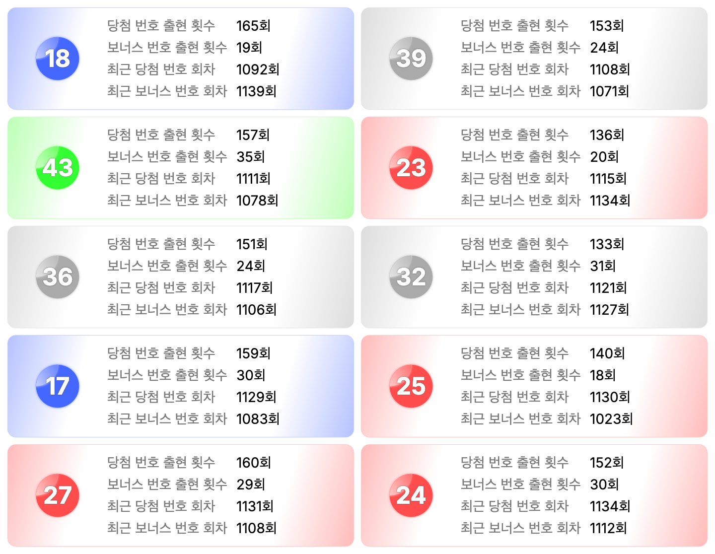 43번은 최근에 나온 회차가 1111회차로 31주 전에 출현했습니다. 43번은 당첨 번호로 157번, 보너스 번호로 35번 나와 총 192번 출현했습니다.
