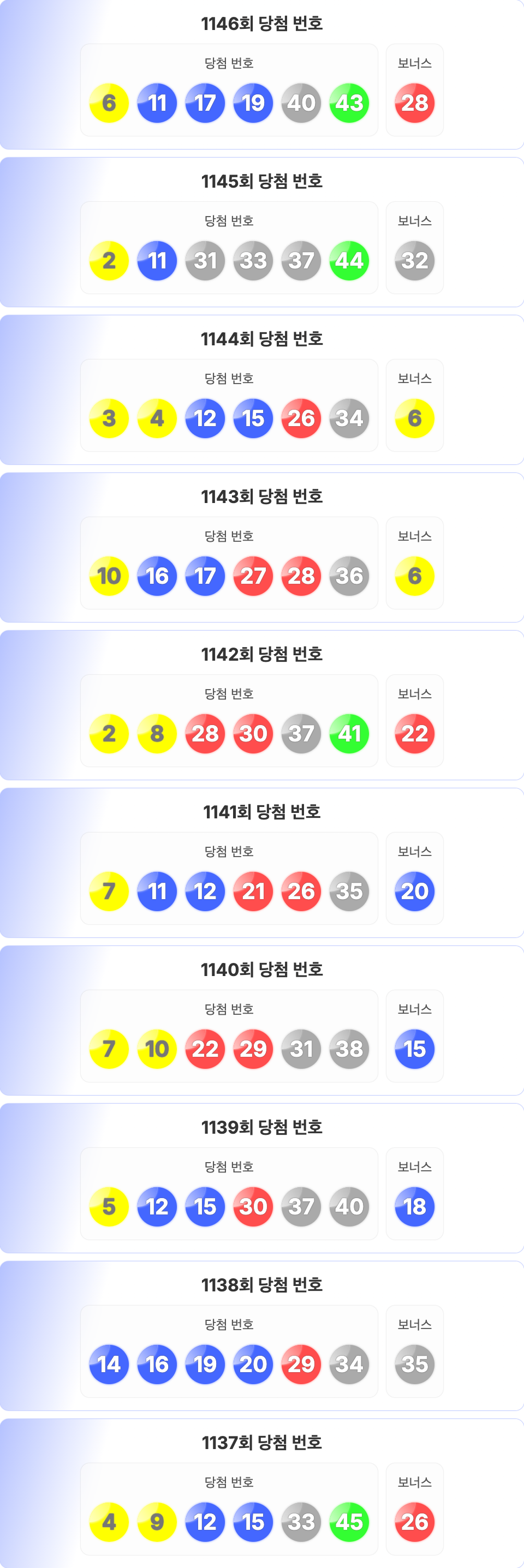로또 1146회를 기준으로 최근 10회차의 당첨 번호 정리입니다. 1137회부터 1146회의 당첨 번호와 보너스 번호를 확인할 수 있습니다.