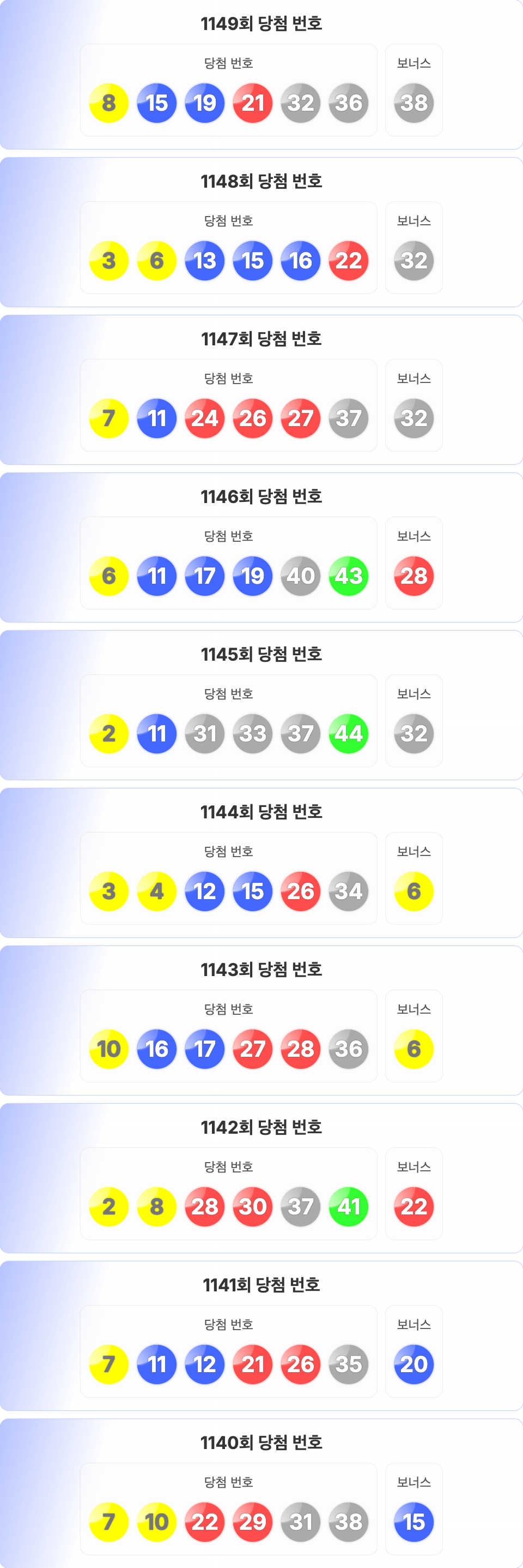 로또 1149회를 기준으로 최근 10회차의 당첨 번호 정리입니다. 1140회부터 1149회의 당첨 번호와 보너스 번호를 확인할 수 있습니다.