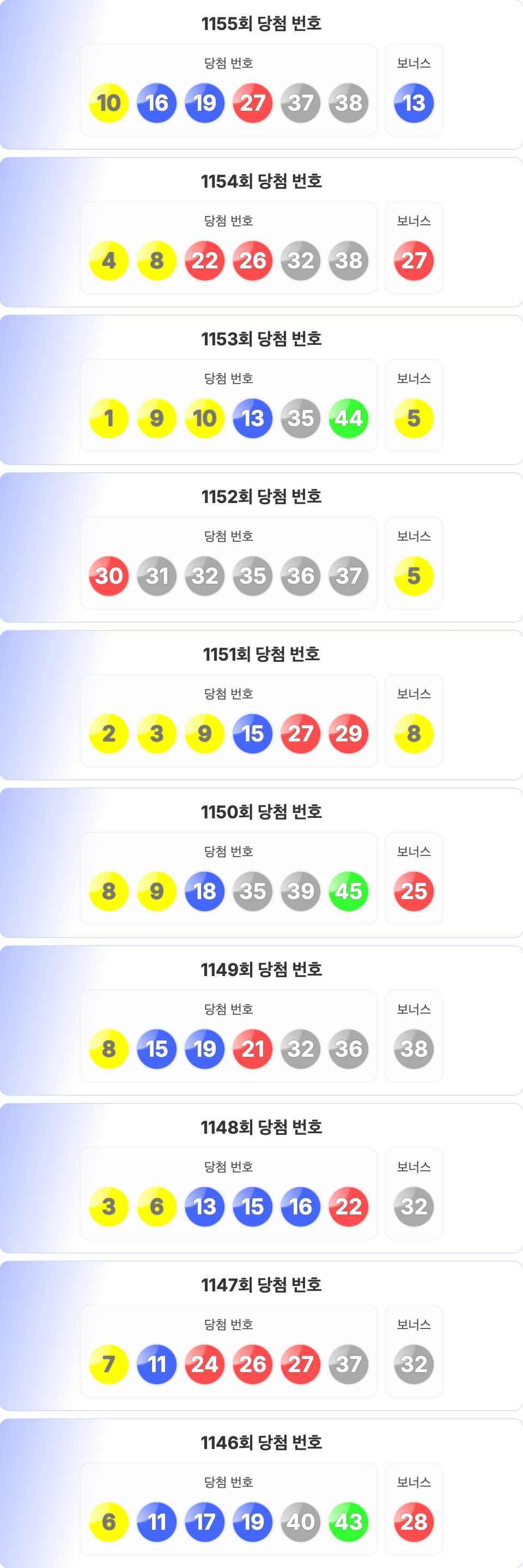 로또 1155회를 기준으로 최근 10회차의 당첨 번호 정리입니다. 1146회부터 1155회의 당첨 번호와 보너스 번호를 확인할 수 있습니다.